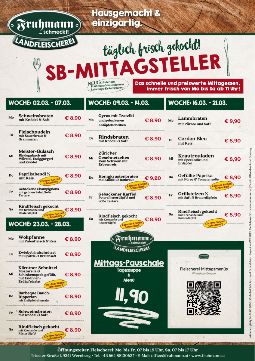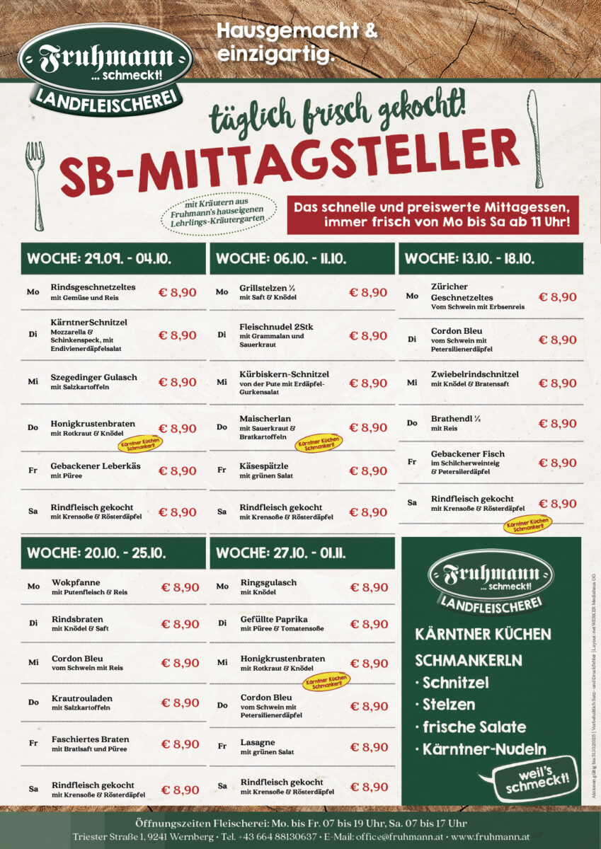 Das schnelle und preiswerte Mittagessen, immer frisch von Montag bis Samstag ab 11 Uhr in der Landfleischerei Fruhmann.